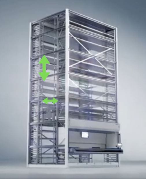 Inventory is stored in two vertical columns—one on the left and one on the right. Each tray holds items based on weight, height, frequency of access, and SKU groupings. The system automatically chooses the optimal tray location to maximize density and balance the load.